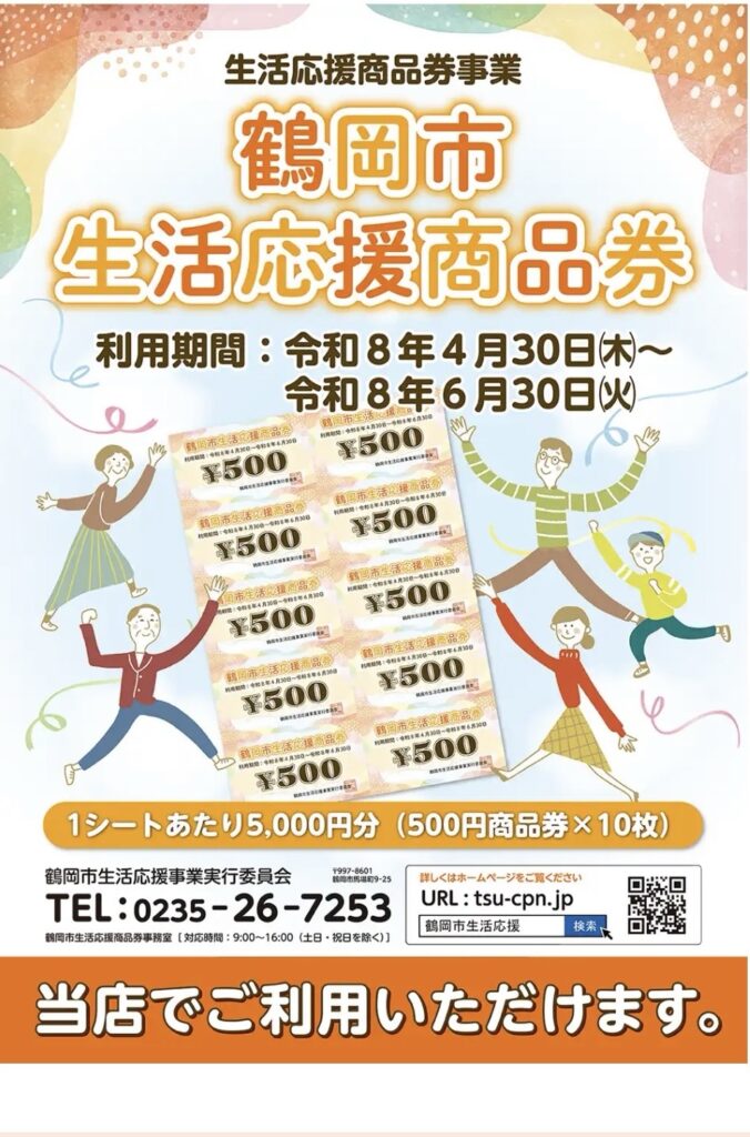 4月30日から鶴岡市生活応援商品券がご利用出来ます。当店でもご使用出来ますのでどうぞご利用ください。